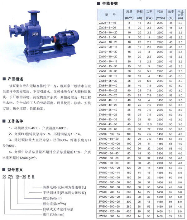 該泵集自吸和無堵塞排污于一身,既可象一般清水自吸泵那樣不需安底閥,不需引灌水、又可抽吸含有大顆粒固體塊、長纖維的污物、沉淀物廢礦雜質、糞便處理及工程污水物,減輕工人的勞動強度,而且使用、移動、安裝方便、較少維修、性能穩定。